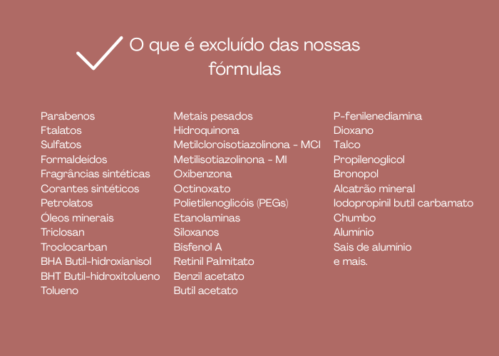 Nossos produtos não contém: parabenos, petrolatos, ftalatos, silicones, glúten, metais pesados, alumínio, fragrâncias sintéticas, corantes sintéticos, talco, PEGs (polietilenoglicóis), oxibenzona, hidroquinona, sulfatos, bisfenóis, triclosan, toluenos, formaldeídos, propilenoglicol e mais, consolidando uma sólida lista de componentes já banidos em diversos países.